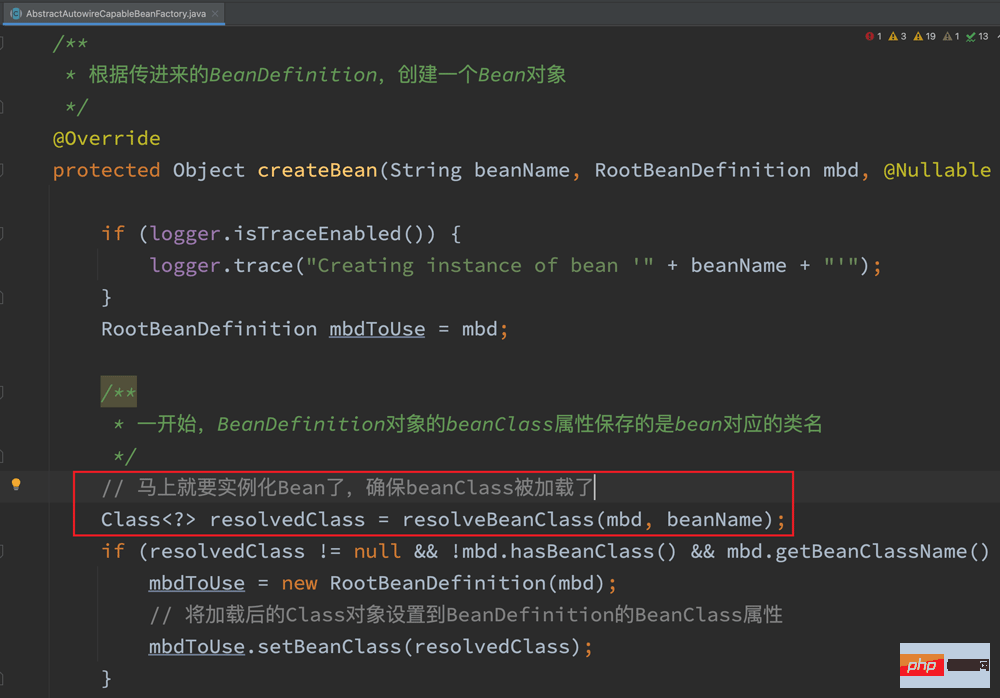 BeanDefinition合并之后,就可以去创建Bean对象了,而创建Bean就必须实例化对象,而实例化就必须先加载当前BeanDefinition所对应的class,在AbstractAutowireCapableBeanFactory类的createBean()方法中,一开始就会调用: