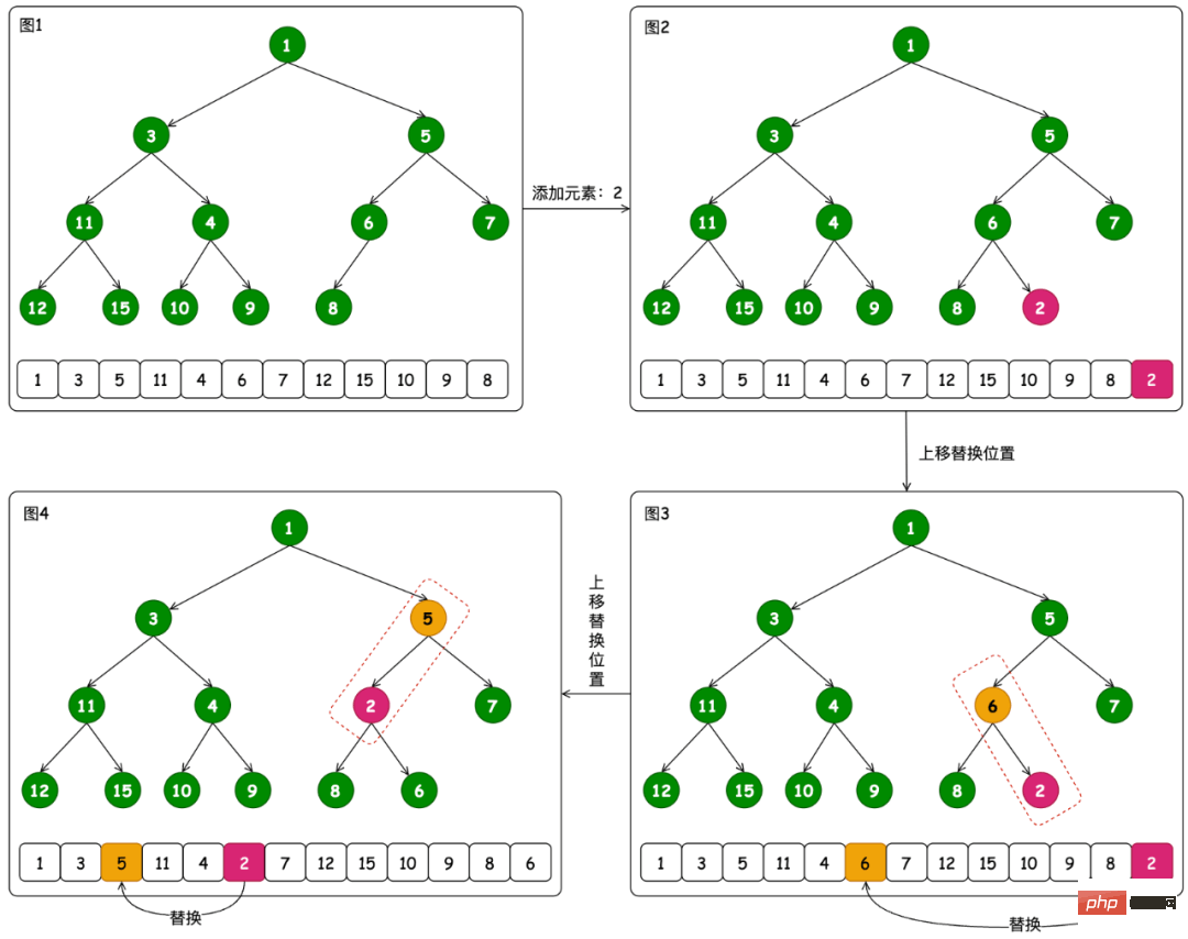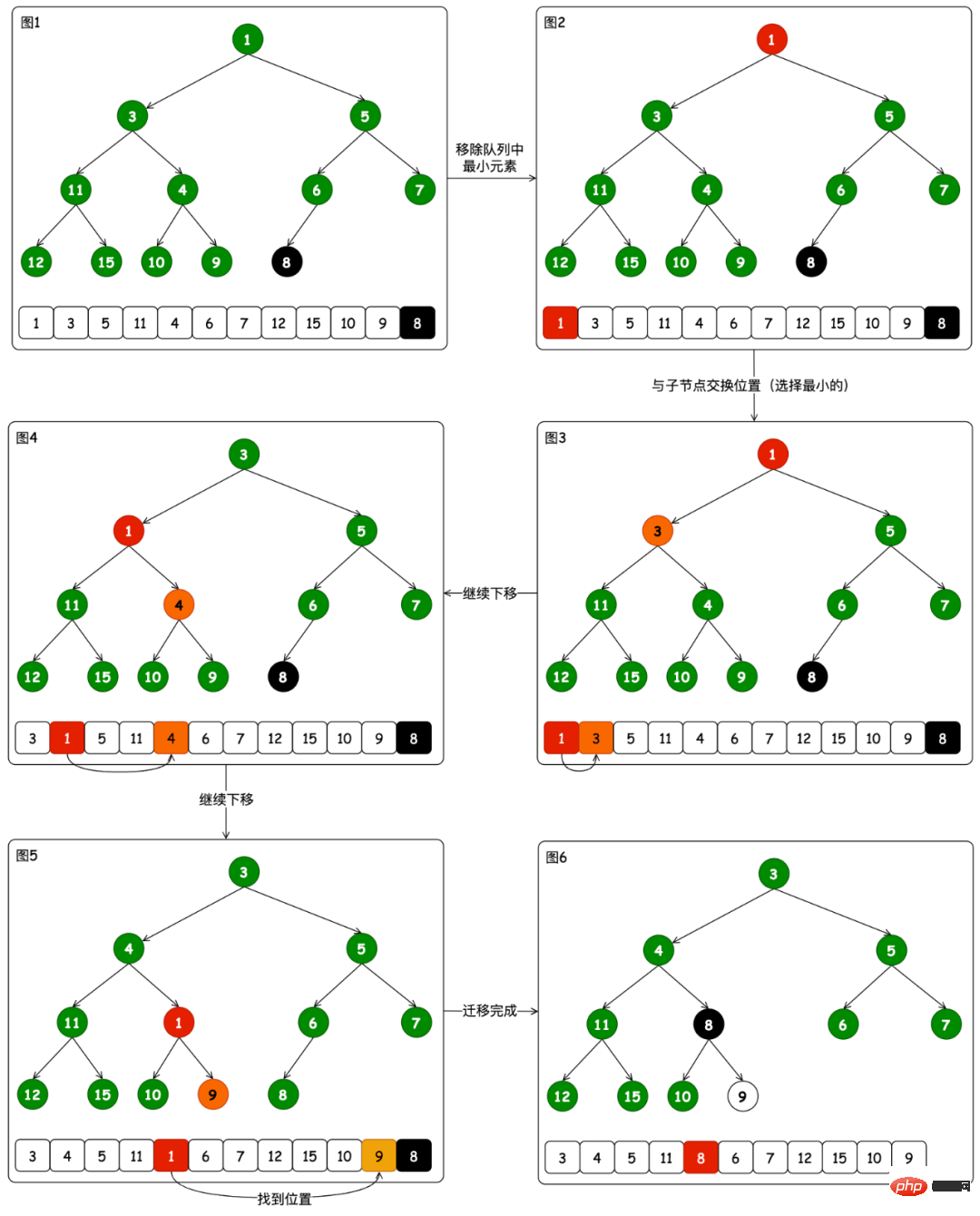 }登录后复制不断地向下迁移元素。这个过程会比对左右子节点的值,找到最小的。所以整个过程会比入堆麻烦一些。