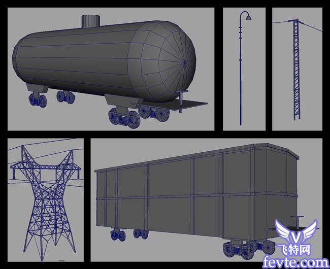 场景中的其它物体也非常简单,主要是罐车以及电线杆等。这些物体都是单独制作,与DF4B车头并不在同一场景中,到最后渲染时才进行合并场景,为的是让机器运行快一些。需要注意的是,这些物体制作时不需要太仔细,尽可能的减少面数。