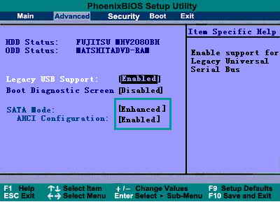 主板方面,在联想部分机型的BIOS中,可以看到SATA工作模式和AHCI功能这两个选项,当SATA模式设置为Enhanced时,AHCI可选择Enable或Disable;当SATA模式设为Compatible时,AHCI选项不可见(默认Disable)。综上所述,这两项设置可能存在的组合一共有3种,只有下图所示的这种组合才支持AHCI: