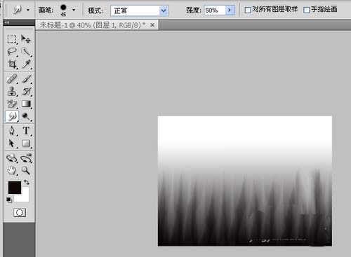 3、选择涂抹工具;并将画笔大小设为柔角45像素,硬度为75%,从灰色区域上下来回拖动鼠标,做出水草效果。