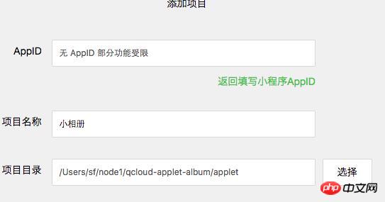 源码下载完成之后,我们打开微信 web 开发者工具,新建项目「小相册」,选择目录applet(或app)。