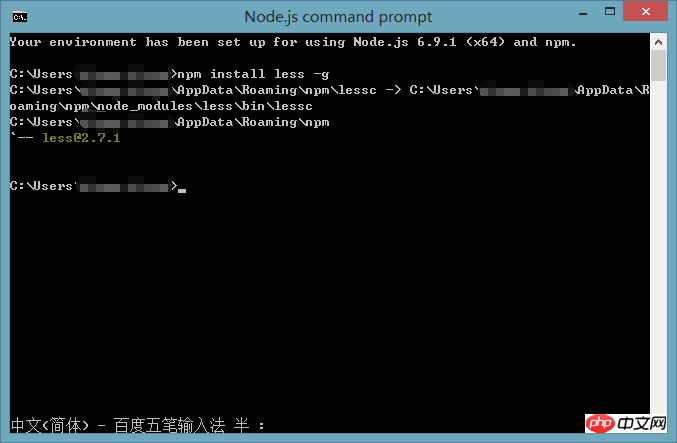 在 nodejs命令窗口输入:npm install less -g,然后回车安装。如下图: