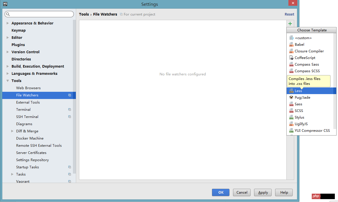 2).展开左边列表最后一项,找到File Watchers。我们可以看到右侧的白色方框,再点击添加图标,选择less。如图所示: