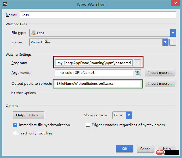 3).在打开的的方框中,我们可以看到一些相关的配置。其他的我们不用管,我们只要关注两个地方:程序的路径和输出路径。 程序路径是我前面安装的 less路径,输出路径这个地方修改一下,将原来默认的.css改成.wxss。如下图: