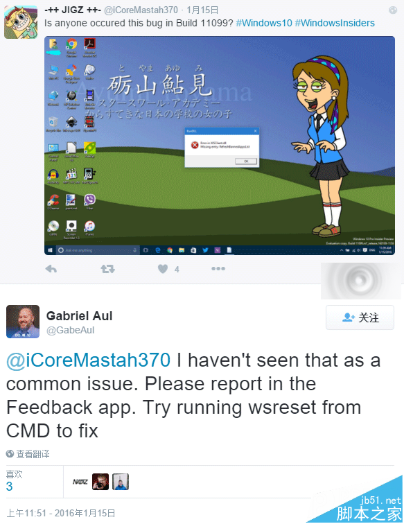 在升级Win10预览版11099后会遇到一个莫名其妙的弹窗,上面显示“WSClient.dll出错丢失条目:RefreshBannedAPPsList”。国外用户也有人遇到了同样问题,微软Windows Insider负责人Gabriel Aul建议用户将此问题在《Windows反馈》中反映,并且给出了临时解决方案。