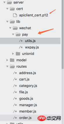 这个早选在wxpay初始代码里已经配置了,pfx: fs.readFileSync(__dirname + '/../../../cert/apiclient_cert.p12'), //微信商户平台证书