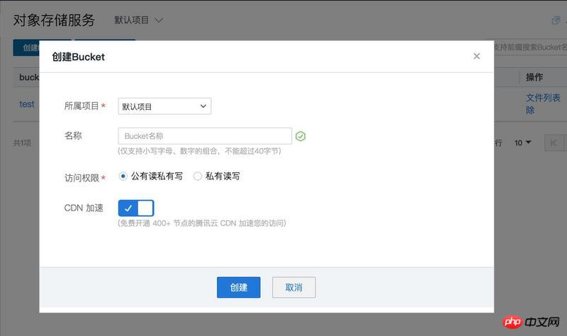 点击创建 Bucket。会要求选择所属项目,填写相应名称。这里,我们只需要填上自己喜欢的 Bucket 名称即可。