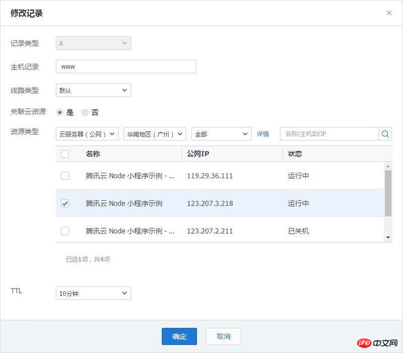 我们还需要添加域名记录,将域名解析到我们的云服务器上,这样才可以使用域名进行 https 服务。在腾讯云注册的域名,可以直接使用云解析控制台来添加主机记录,直接选择上面购买的 CVM。