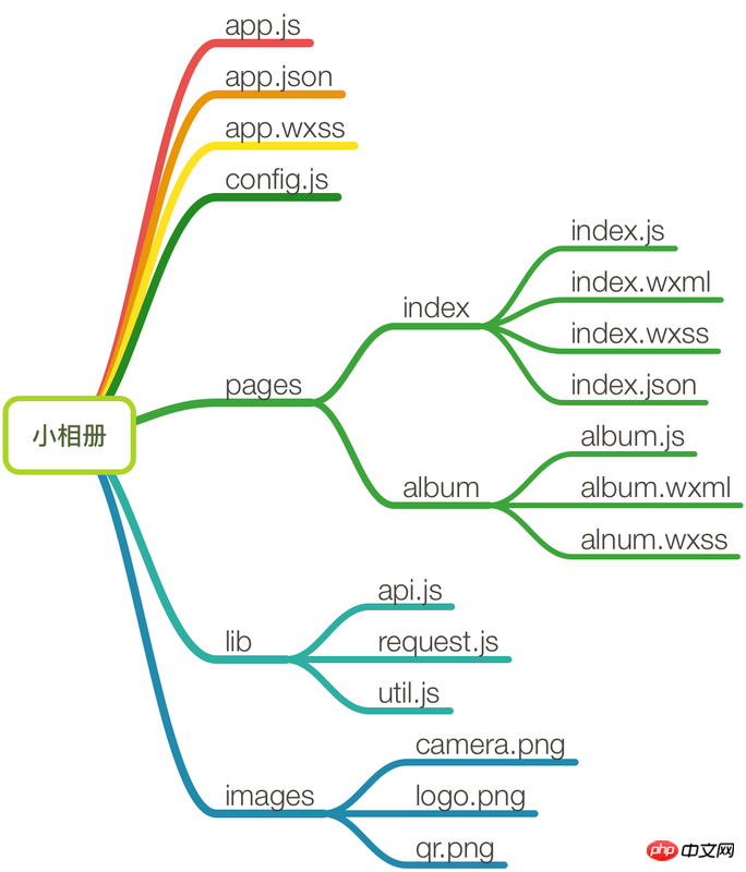 在 pages 目录下,有两个 page 页面,分别是 index 和 album。页面结构算是比较简单的,其中 index 是小程序启动时默认进入的页面。每个页面下,至少要有 .js(页面逻辑)和 .wxml(页面结构)两个文件,.wxss(页面样式表)和 .json(页面配置)文件为选填。你可能注意到了,这些文件的文件名与父目录的名称相同。这是微信官方的规定,目的是减少配置项,方便开发者。