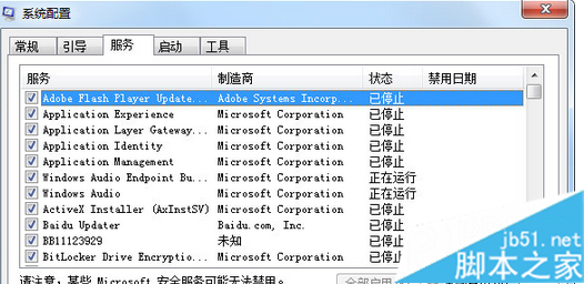 2、在打开的系统配置窗口中,切换到“服务”标签页,把其中不必要的服务全部打勾,然后点击右下角的“全部禁用”;
