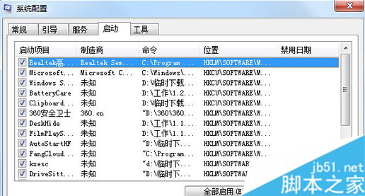3、再切换到“启动”标签页,把其中不必要的启动项全部打勾,然后点击右下角的“全部禁用”,确认之后,重新启动Win7系统就可以了。