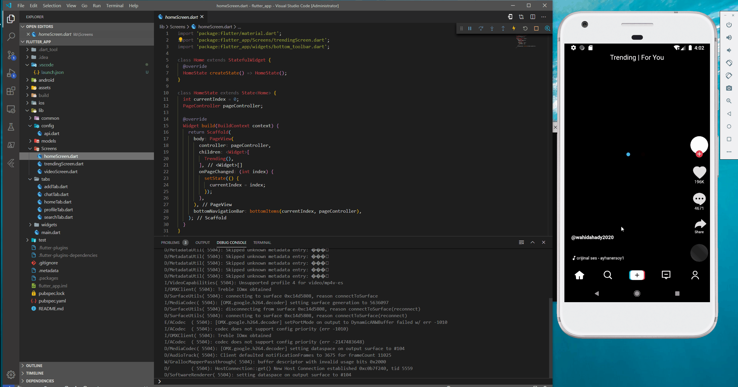 最近花了两天时间研究使用Flutter开发一个抖音国际版. 个人感觉使用Flutter开发app快得不要不要的额. 两天就基本可以开发个大概出来. 最主要是热重载,太方便实时调整UI布局了. 相应速度极快. 如下图: