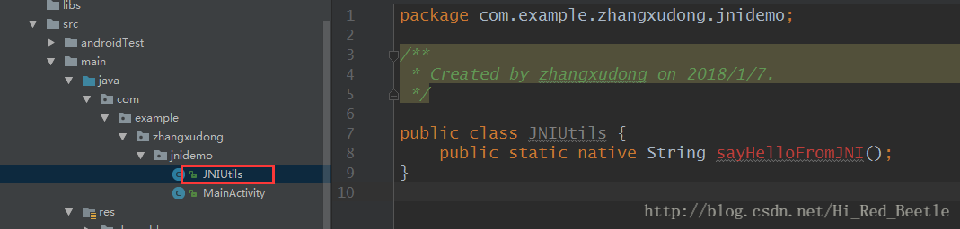 上面代码中的JNIUtils.sayHelloFromeJNI()就是我们在与MainActivity相同的包中新建JNIUtils类后在里面编写的native方法。如下所示:
