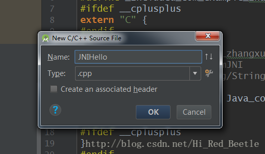 输入要新建的C/C++文件名称JNIHello,这里我们用C++来编写,所以Type为.cpp,如果你选择用C来编写,那么Type选为.c,点击ok。这里说一下,在我们进行NDK开发的时候,选择用C还是C++,在编写代码的时候除了C和C++基本的语法不同外,还是有许多不同地方需要注意。我们后续会慢慢介绍。这里先默认跟着我的步骤来。