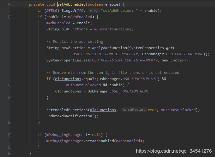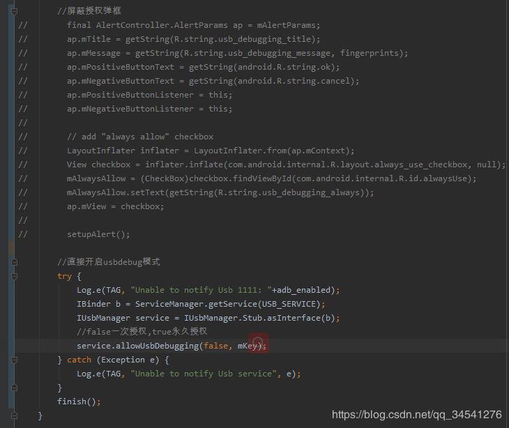 当adb_enable为0时会关闭adb调试模式,为1是会有弹框提示点击确认时会默认打开usb调试模式;通过代码查找发现在frameworksbaseservicesusbjavacomandroidserverusbUsbDeviceManager.java中监听