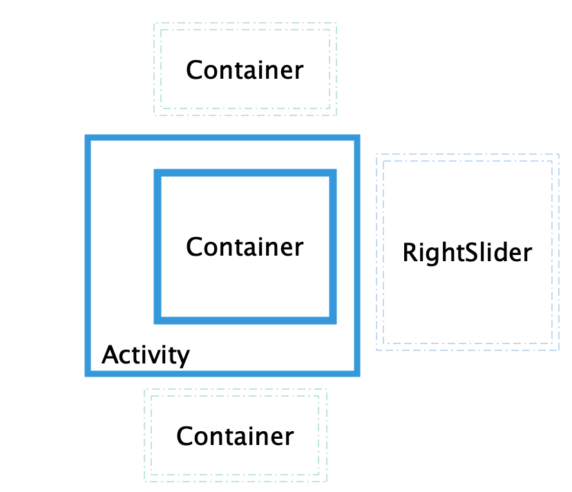 每个Container 共用一个RightSlider,这样属于事件的分发处理不在一个ViewGroup的U型模型里了,这样的分发顺序也是属于自己的一个大胆尝试,想着实在不行,还是要把Activity内布局包一层,将Container和RightSlider 放在一个U型结构里去处理。