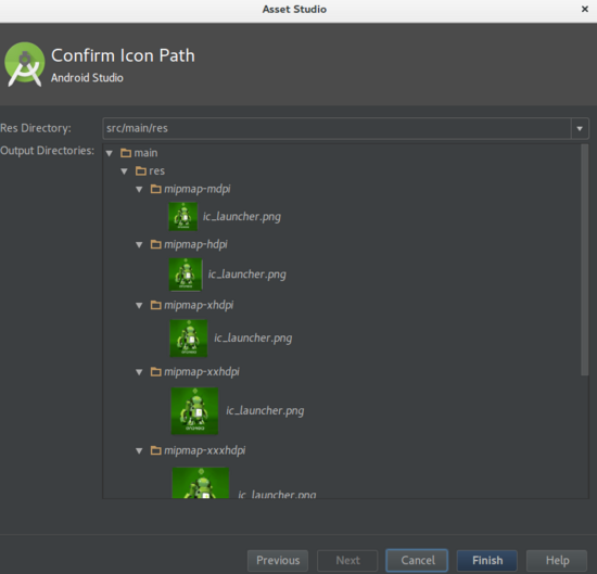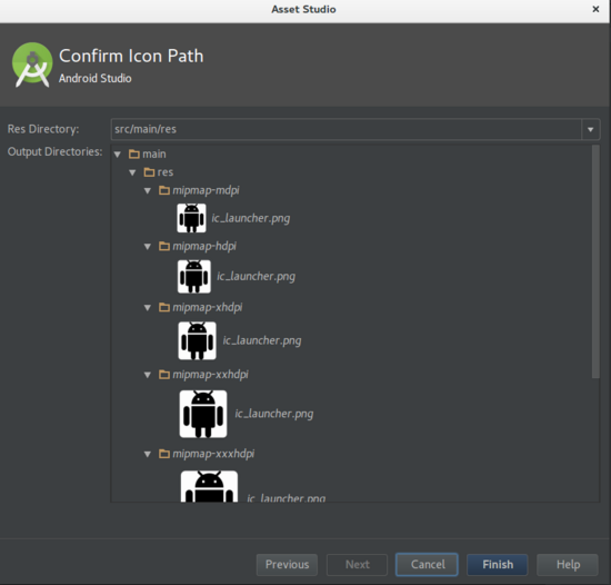 点击Finish(完成)按钮, 就会为我们在相应目录生成对应不同屏幕分辨率的图标了, 默认的是: