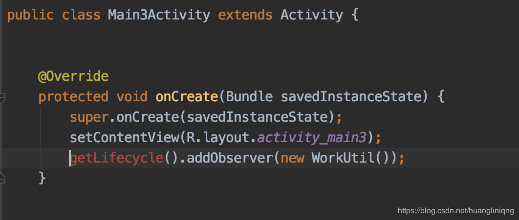 这样是不是简洁多了呢,那么我们为什么可以在Activity中直接使用getLifecycle().addObserver(new WorkUtil());呢,其实使用的是LifecycleOwner.getLifecycle, LifecycleOwner是单一方法接口,表示类具有 Lifecycle,而如果activity继承自AppcompatActivity或Fragment继承自androidx.fragment.app.Fragment他们本身就是一个LifecycleOwner的实例,这是AndroidX库帮我们自动完成的。