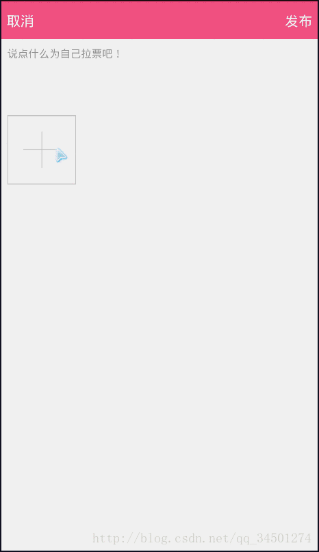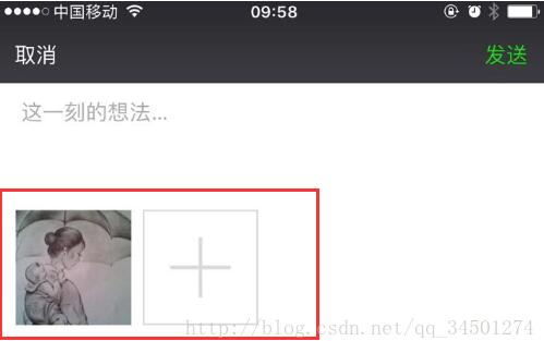 微信上的效果是,先选中图片后才会进入这个界面,这里实现的是我现在项目中用到的效果:默认显示一个带+好的图片,点击这个图片,会让你选择图片。