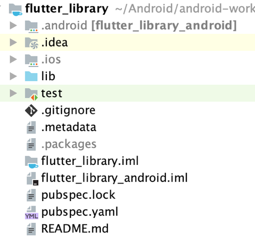 其中,flutter_library为Flutter模块名。执行上面的命令后,会在原生工程的同级目录下生成一个flutter_library模块工程。Flutter模块也是Flutter工程,使用Android Studio打开它,其目录如下图所示。
