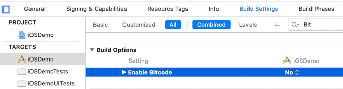 默认情况下,Flutter是不支持Bitcode的,Bitcode是一种iOS编译程序的中间代码,在原生iOS工程中集成Flutter需要禁用Bitcode。在Xcode中依次选择【TAGETS】→【Build Setttings】→【Build Options】→【Enable Bitcode】来禁用Bitcode,如下图所示。