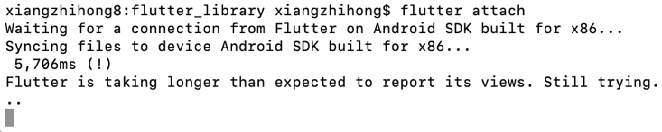 那么,能不能在混合项目中开启Flutter的热重载呢?答案是可以的,只需要经过如下步骤即可开启热重载功能。首先,关闭原生应用,此处所说的关闭是指关闭应用的进程,而不是简单的退出应用。在Flutter模块的根目录中输入flutter attach命令,然后再次打开原生应用,就会看到连接成功的提示,如下图所示。