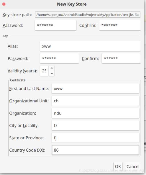 这样我们就可以打开签名的图形界面了,然后通过 create 创建一个新的签名文件,这里注意一下,我们必须将创建成功的签名文件保存起来,不能将其丢失(如下:.jks文件)