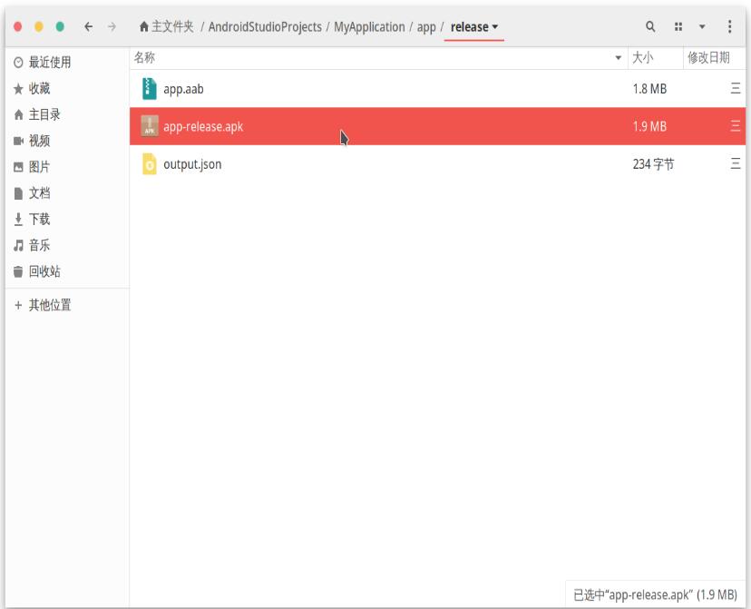 这里可以选择 debugrelease 版本,一个代表测试,一个是发布版。然后完成就可以到你指定的文件夹中去查看 apk 文件是否生成了。当然,as也会提示成功或者失败情况的,这就是我们刚刚签名打包生成的 apk 安装包文件了。如果你要将这个文件进行安装的话,就必须得先卸载 run 发布的应用才可以成功安装。