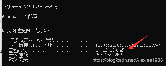 首先用大家比较熟悉的电脑端局域网地址和外网地址的获取方式对比一下:(1)、电脑端局域网地址获取方式,可以通过在终端命令行输入ipconfig进行查看,如下图IPv地址标识的就是本机的局域网地址: