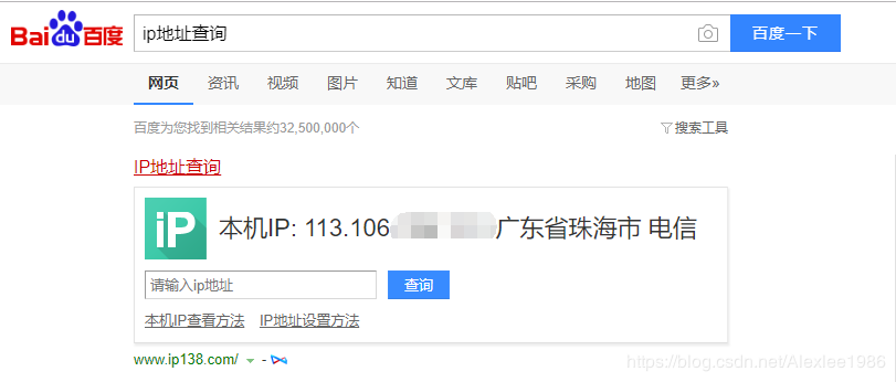 (2)、电脑端外网地址的获取方式,可以通过在浏览器里面查询,如在百度页面搜索“IP地址查询”查看本地外网地址,如下图是笔者本机的外网地址: