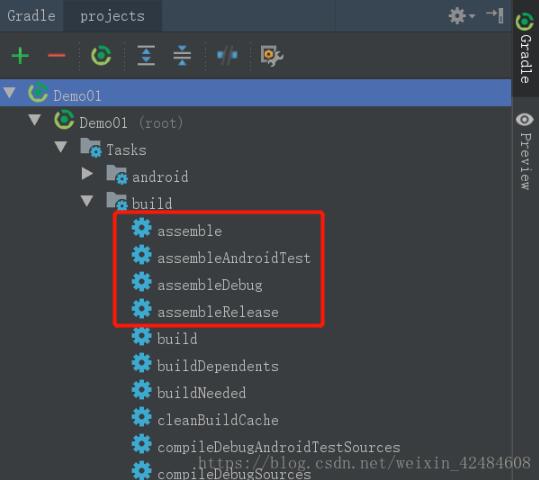 3、使用系统签名对apk进行签名,首先需要打未签名的包,Android Studio环境下点击右侧Gradle按钮,弹出目录,打开Tasks->build->assemble...,其中assemble开头的几项即是打包任务,双击相应项即可获取相应的包