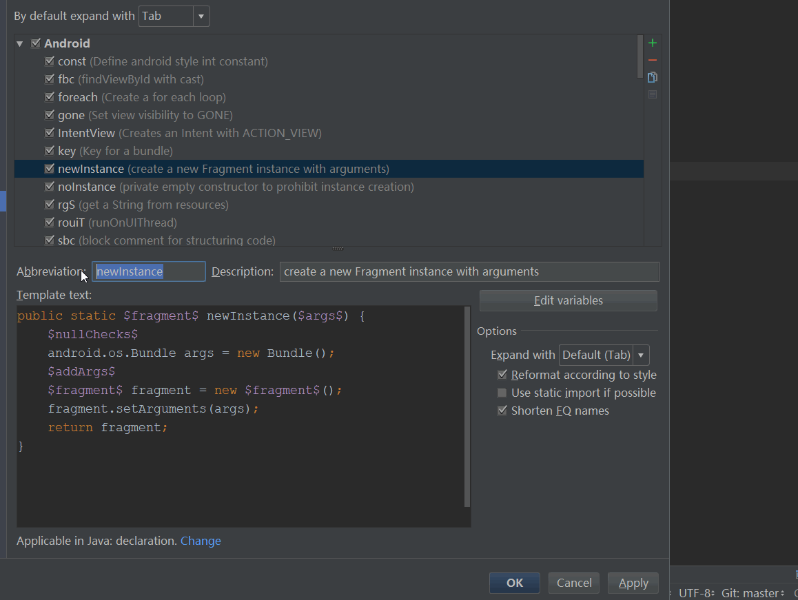 想必大家都知道 android studio 的 live templates 功能,那真是各种方便,比如你想使用 newInstance 去生成一个类的实例: