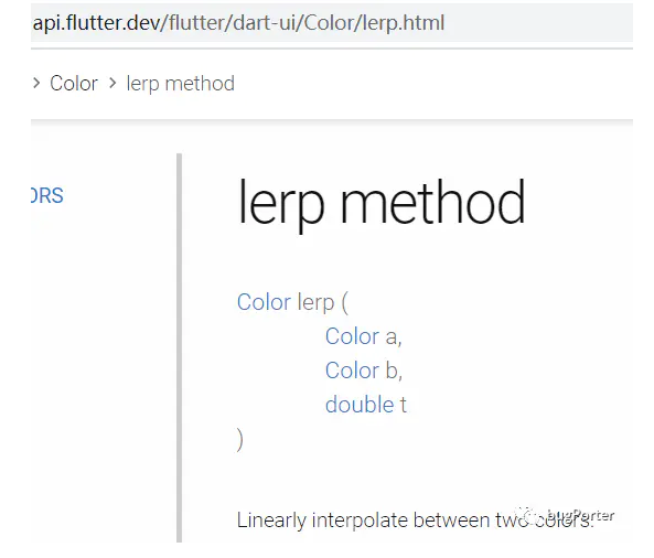 既然能改变颜色了,我们也需要知道pageView滚动的时候究竟要改什么颜色。从一个页面滚动到另一个页面的过程中,颜色都是线性渐变的,要获取这个过程中的颜色可以使用flutter的Color类提供的lerp方法,作用是获取两种颜色之间的线性差值