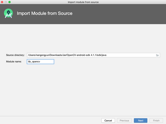将解压后的OpenCv Sdk目录下的sdk目录里面的java包通过Moudule的方式导入到Studio中。