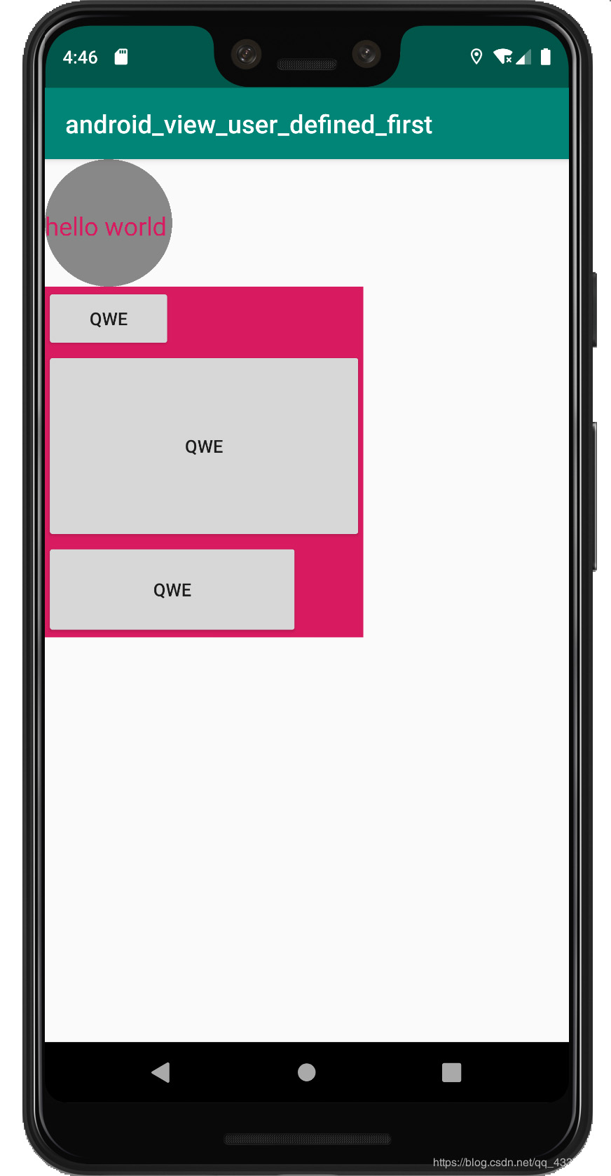 <com.entry.android_view_user_defined_first.views.MyLinearLayout android:layout_width="wrap_content" android:layout_height="wrap_content" android:background="@color/colorAccent"> <Button android:layout_width="100dp" android:layout_height="50dp" android:text="qwe"/> <Button android:layout_width="250dp" android:layout_height="150dp" android:text="qwe"/> <Button android:layout_width="200dp" android:layout_height="75dp" android:text="qwe"/> </com.entry.android_view_user_defined_first.views.MyLinearLayout>