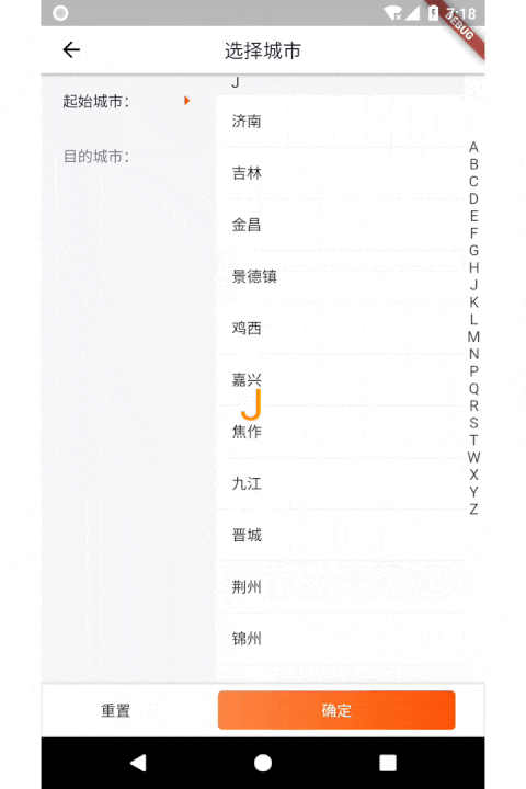 采用了Flutter 的Stack布局(非常类似Android FrameLayout),下层是城市选择页面数据,上层盖了一层SliderBar