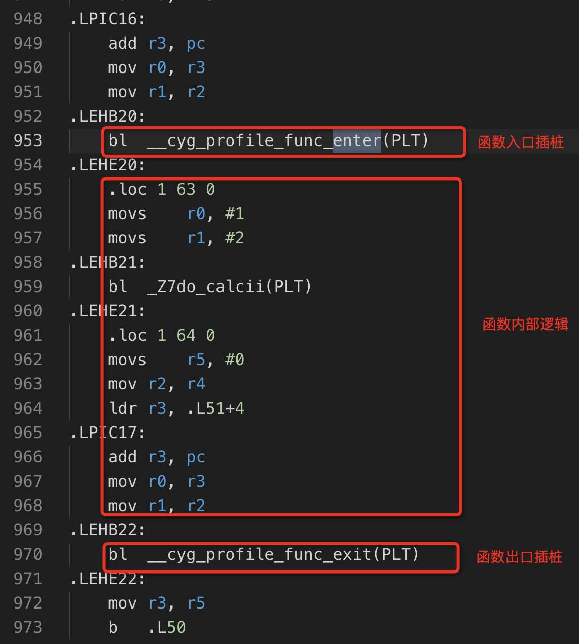 这里需要格外注意,某些不需要插桩的函数可以使用__attribute__((no_instrument_function))来向编译器声明。