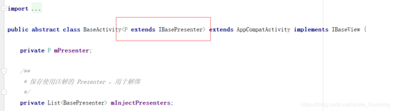 由于上篇文章中,我们使用了依赖注入,所以这里的 BaseFragment 类的泛型参数就给我们去掉了。还有 BaseActivity 在这一版本中,我也去除了这个泛型参数,如图: