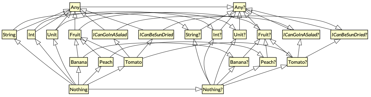 注意啦,我们再看看 Nothing 在类型系统中的位置。Nothing 与 Any 相反,是一切类型的子类!也就是说 Nothing,是 Fruit、是 School、是 Money、也是 Any。Nothing 意味着不可达的状态,每一种类型都包含这种不可达的状态,因而这种状态 Nothing,是这些的子类。