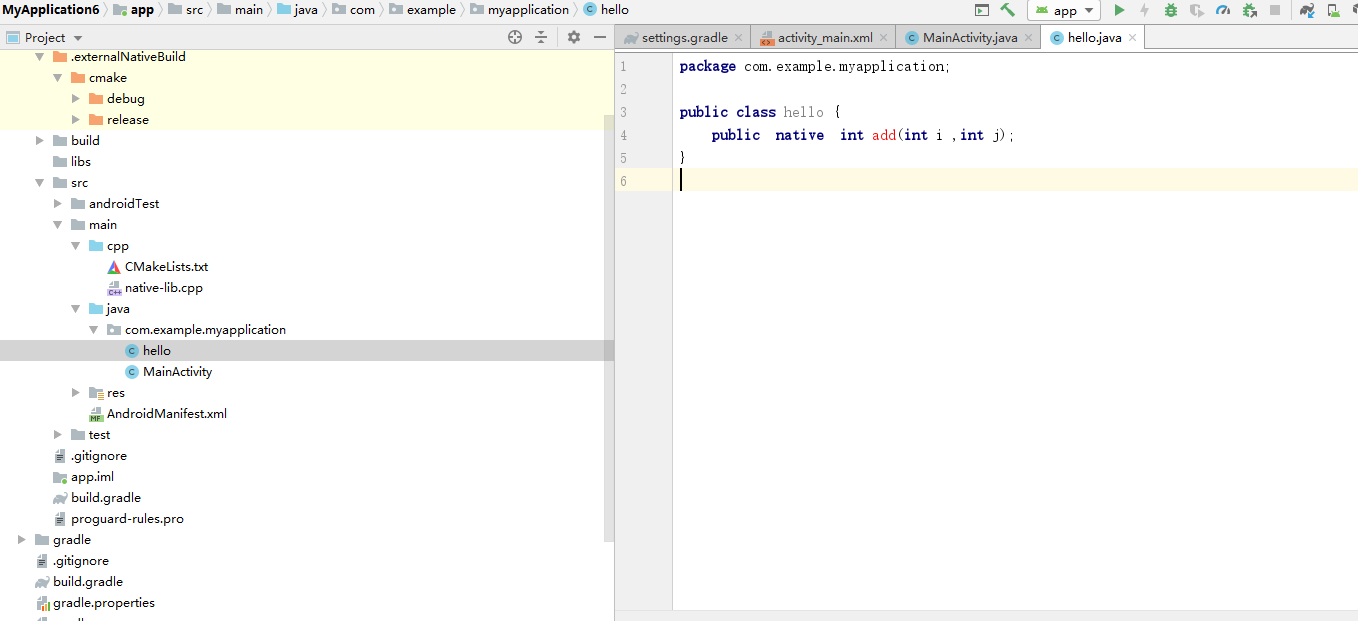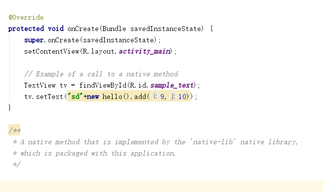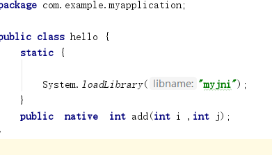 接下来开始写自定义的一个native方法,新建一个Hello.java文件,里面写一个add求和的native方法,如下