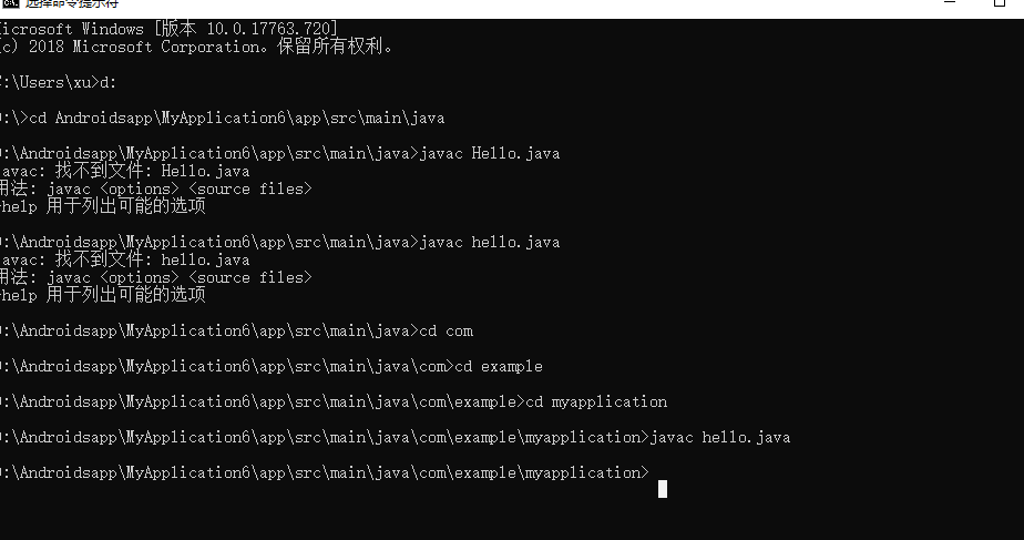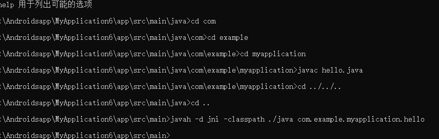 javah -d jni -classpath ./java com.example.myapplication.hello,后面是包名+文件名不带后缀,请改成自己的包名,如图