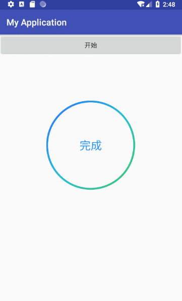 <?xml version="1.0" encoding="utf-8"?> <LinearLayout xmlns:android="http://schemas.android.com/apk/res/android" android:layout_width="match_parent" android:layout_height="match_parent" xmlns:app="http://schemas.android.com/apk/res-auto" android:orientation="vertical"> <Button android:layout_width="match_parent" android:text="开始" android:id="@+id/btn_start" android:layout_height="wrap_content" /> <com.daodaojk.myapplication.view.CountDownProgressBar android:id="@+id/cpb_countdown" android:layout_width="200dp" android:layout_marginTop="100dp" android:layout_gravity="center_horizontal" app:countDown_centerTextSize="25dp" app:countDown_circleWidth="4dp" app:countDown_firstColor="@color/text_gray_ccc" app:countDown_secondColor="@color/text_blue" app:countDown_isShowGradient="true" app:countDown_centerTextColor="#2395FF" android:layout_height="200dp" /> </LinearLayout>