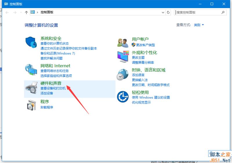 1、打开控制面板,点击“硬件和声音”。