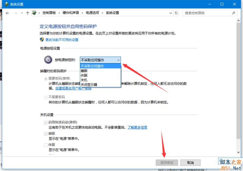 3、在“按电源按钮时”后面进行设置,选择“不采取任何操作”,然后保存修改就可以了。