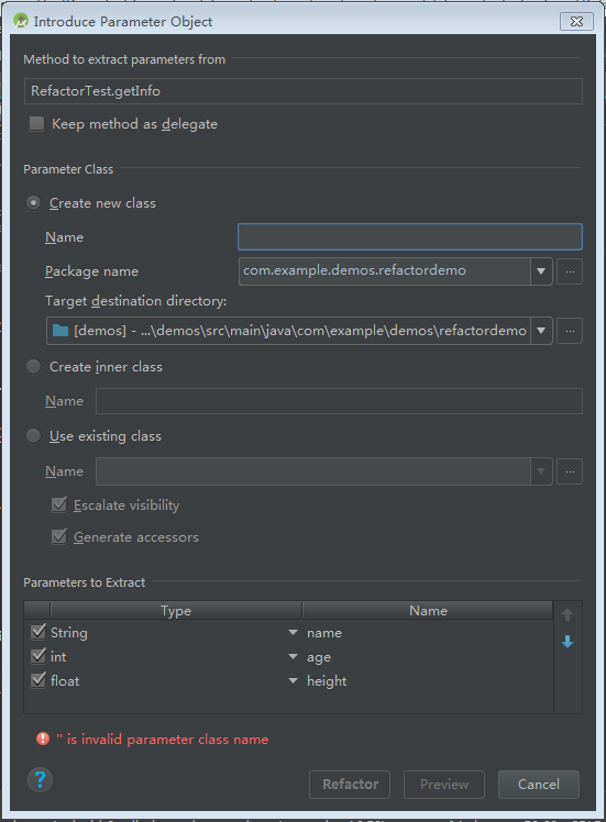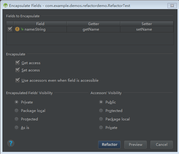 通过该对话框,可以选择要封装的字段,设置修饰符等。默认选择时,name字段的修饰符从public变成了private,这也就避免了外部类通过实例直接访问它。