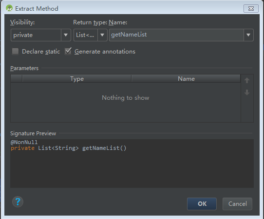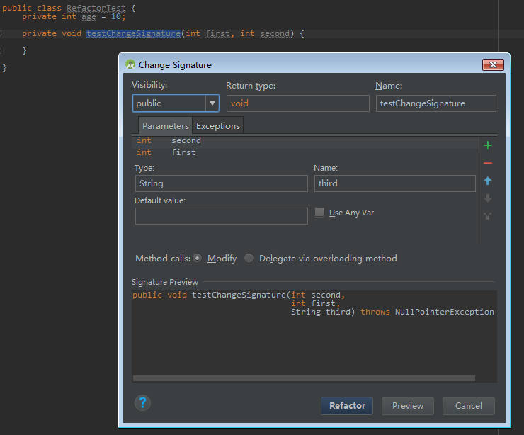 选中方法名后,执行该重构方法后,会弹出如下对话框,可以对该方法各种属性进行修改,添加/删除参数,调整参数顺序,新增/删除异常等。