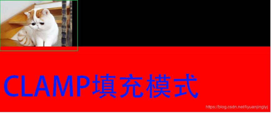 TileMode.CLAMP:用边缘色彩来填充多余空间,CLAMP就是以X轴填充X边缘颜色,以Y轴填充Y轴边缘颜色,而XY非图片相交区域以填充Y轴的颜色继续填充。(这里估计博主故意把猫右边缘填充了黑色,Y边缘填充了红色,框起来的地方是原图)