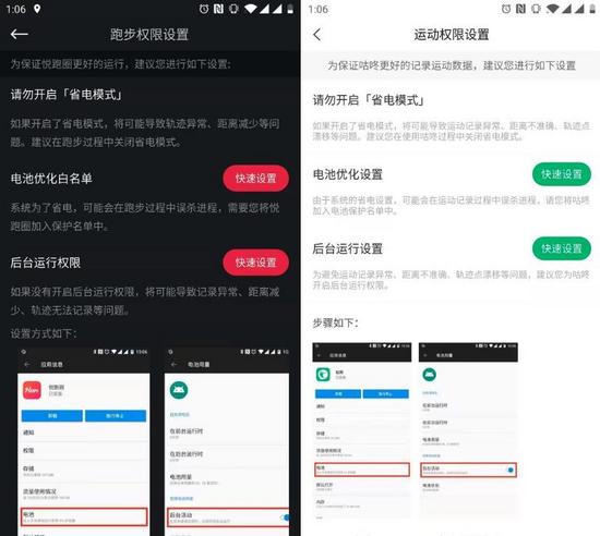 在之前做的跑步应用中,我在设置里增加了一个权限设置页面,将上面提到的以及一些运行所必须的权限设置放在这里面。最近发现友商某咚也跟进了,图 1 是我们做的,图 2 是某咚做的:
