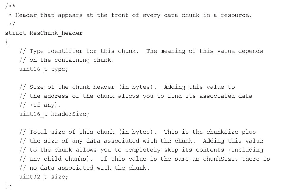 整个 resources.arse 文件,实际上是由一个个 ResChunk (以下简称 chunk) 拼接起来的。从文件头开始,每个 chunk 的头部都是一个 ResChunk_header结构,它指示了这个chunk的大小和数据类型。